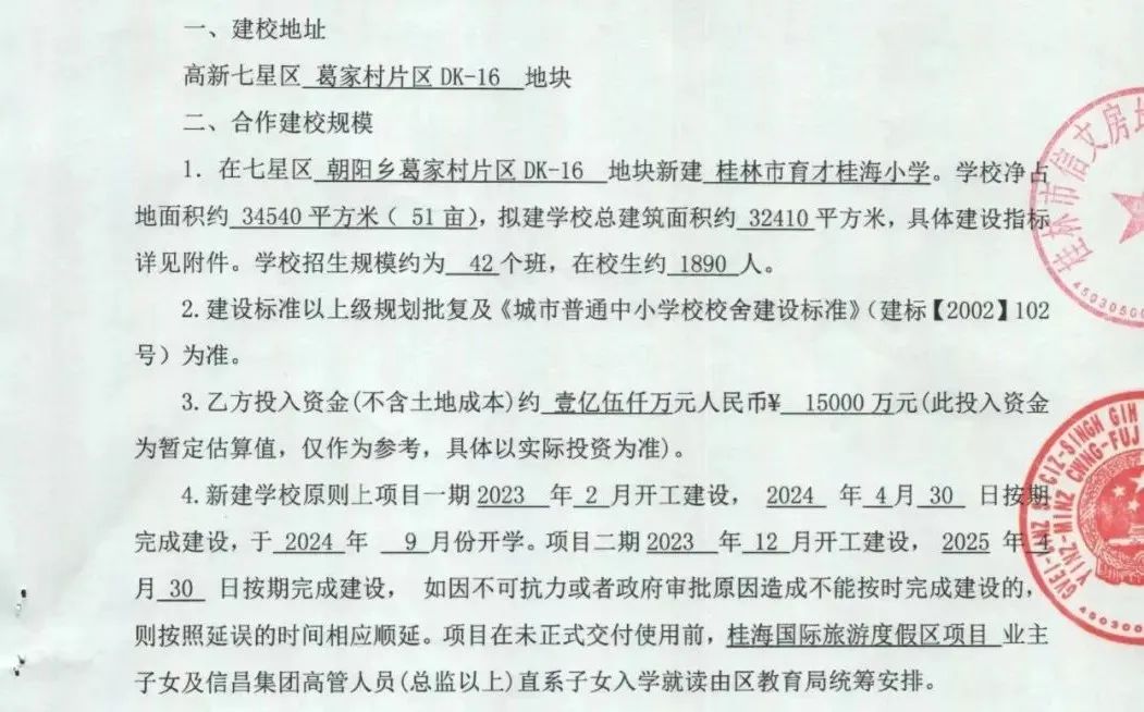 桂林市育才桂海小學,由信昌集團投資約1.5億新建市屬公辦小學。凈占地面積約 34540平方米( 51畝),總建筑面積約 32410平方米,計劃2023年2月開工建設,于2024 年 9 月份開學,招生規(guī)模約為42個班。屆時將成為桂林市首屈一指的公辦小學,為七星區(qū)新增 1890 個優(yōu)質學位。