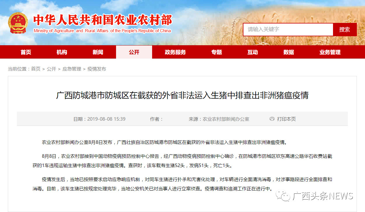 8月8日,據(jù)農(nóng)業(yè)農(nóng)村部網(wǎng)站消息,廣西防城港市防城區(qū)在截獲的外省非法運(yùn)入生豬中排查出非洲豬瘟疫情。目前,該車生豬已按規(guī)定處理完畢,疫情調(diào)查和追溯工作正在進(jìn)行中。