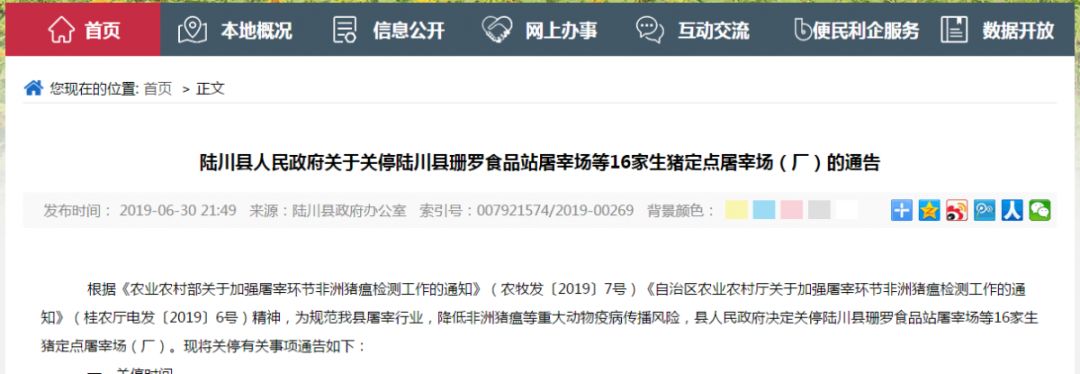 圖為陸川縣關(guān)停16家生豬定點(diǎn)屠宰場(chǎng)的通告。